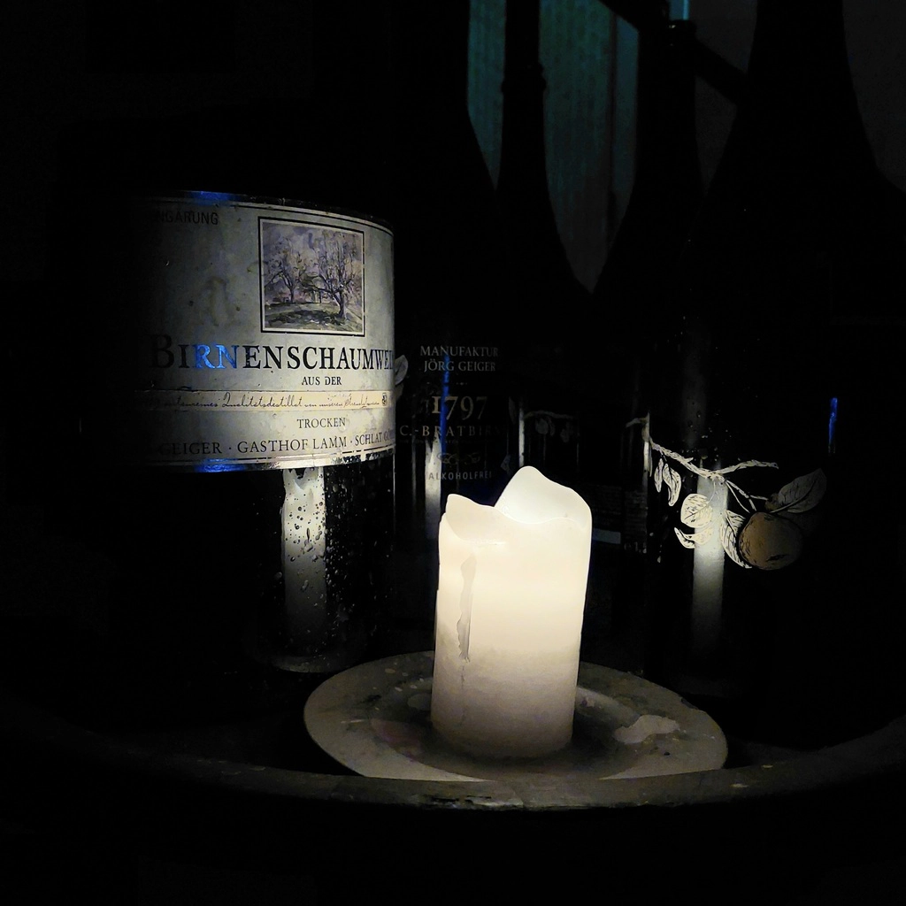‚Einfach‘ nur Obstsaft, Kräuter, Blüten, Gewürze und Kohlensäure schaffen außergewöhnliche Genussmomente. Aber wie so oft – die richtige Mischung machts. Geiger hats drauf. Der Höhepunkt unserer Proben war sicherlich die Champagner Bratbirne – zuerst ohne Alkohol und dann mit – bei Kerzenlicht im Flaschengärkeller, zu verkosten.
