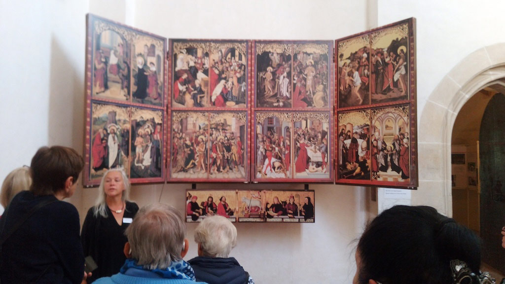 Mit dem Bus erreichen wir nach 1,5 Std. Blaubeuren. In 2 Gruppen geteilt, zeigen uns die Stadtführerinnen, Altstadt, „Spitel“, das frühgotische Kloster mit seinem berühmten Hochaltar im ehemaligen Mönchschor aus dem 14. Jh.